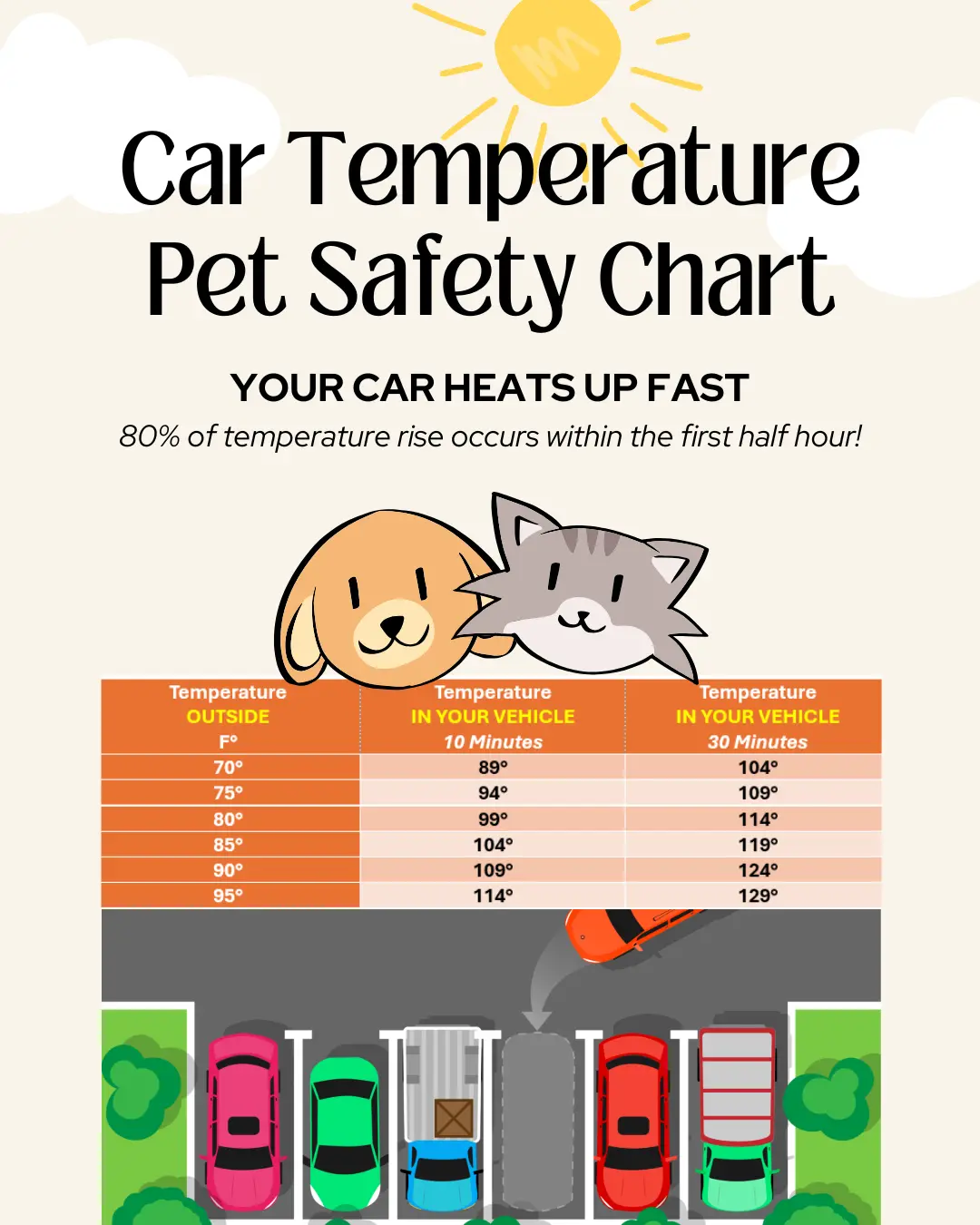 Many pet owners don’t realize how quickly a parked car can become dangerously hot, even on mild days. Studies show that when the outside temperature is just 70°F, the inside of a car can reach 104°F in 20 minutes. On warmer days, temperatures inside a vehicle can soar past 129°F in less than 30 minutes, putting pets at extreme risk of heatstroke, dehydration, and even death.